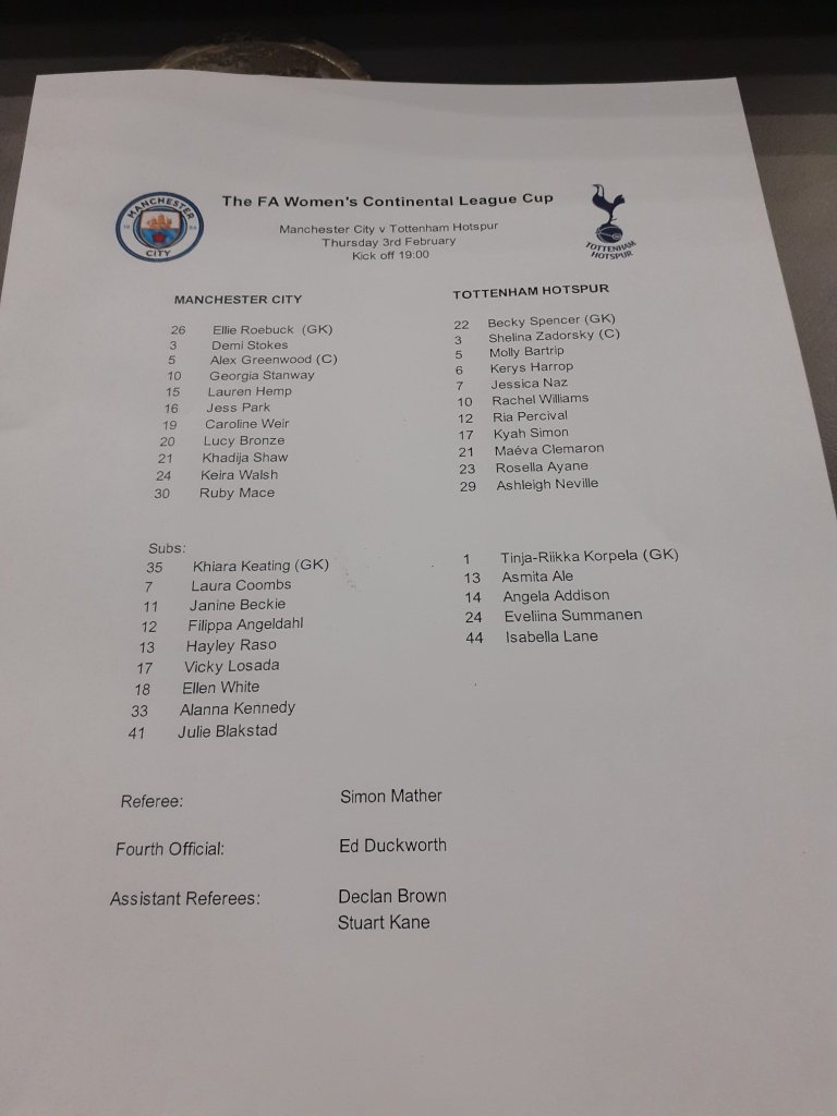 This is evident in a photo of the official Conti Cup semi-final team lists (shared by the Women’s Football Podcast). The Manchester City bench includes eight outfield players, each has played dozens of games in the top-flight (WSL or equivalent); most have storied international careers. The Spurs bench, for the club’s first ever semi-final appearance, includes only four outfield players. One, Eve Summanen, joined Spurs barely a week ago. The other three have a combined total of 21 WSL starts. The gap in experience is glaring. But it’s the radically depleted number of players that has meant Rehanne Skinner has few options for in-game management. Indeed, in this case every available player was used in the second half.