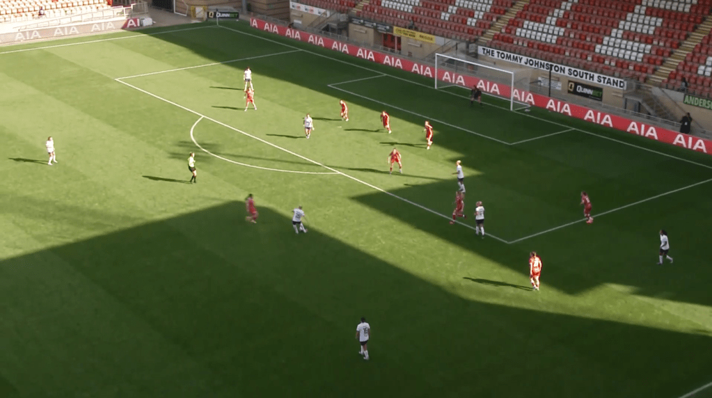 As also hinted at in Vilahamn’s speech at half time, I feel the preference for attacking from one side or other is more to do with personnel and relationships, rather than an out and out tactical thing. The attackers and the midfielders all being right footed means that it is easier for them to drop into that space and play quick short passes or look for channel balls on the right, for players to run on to. Clinton’s playstyle exacerbates this, as she mostly likes to stay in the half space or in between the lines (pockets, as Vilahamn called them in his speech), and then look for a pass inside. Conversely, Naz, being a natural winger, likes to carry it up the pitch, while also combining with the full back.