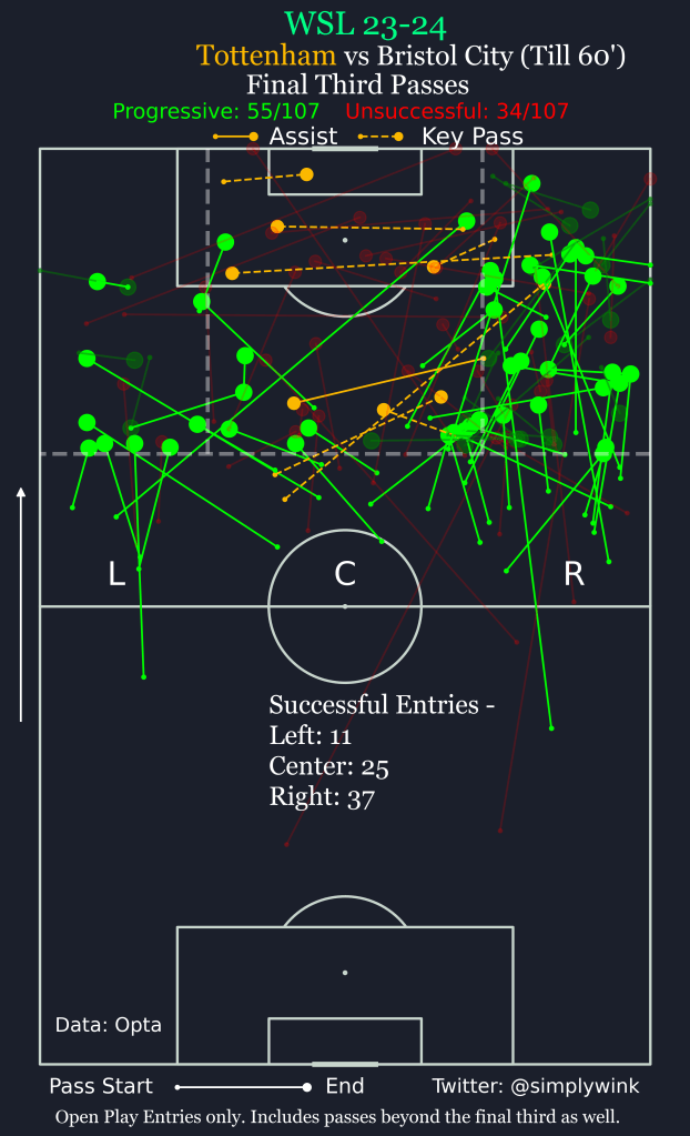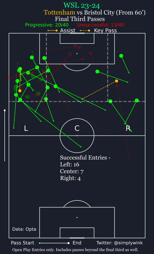 Tottenham’s passes in the final third of the pitch, before and after Jessica Naz coming on