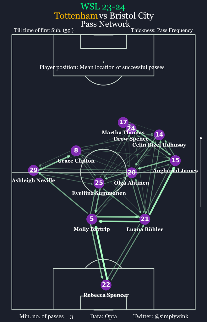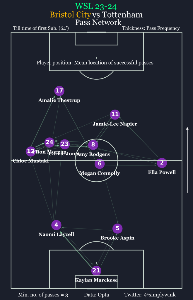 Without the ball, which they were for most of the game, Bristol played a 442 mid block, which transitioned into a 4411 when Spurs were able to get past their first line of pressure. One of the strikers would drop in to mark one of Tottenham’s 2 midfielders closest to the ball, while the other one would stay close to the Spurs center backs. The Bristol attackers were also very flexible in interchanging their roles. There were instances when Carrie Jones, who started as the left winger, would swap positions with the striker Ffion Morgan. This is reflected in their average positions below. On the ball, Bristol mostly played it long; trying to regain the ball high up the pitch and playing from there on, rather than trying to play through the third. This also is reflected in their pass map, with the average on the ball locations of players high up the pitch, with very low number of successful passes in-between them.