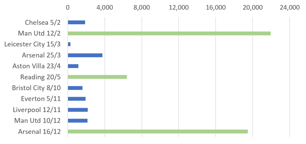 We can see that Spurs lag behind some big and some smaller clubs in terms of support (see chart below). Arsenal have jumped ahead, in part because they have held lots of games in their main stadium but also because they built on their links with the Lionesses, especially after Euro 2022. But Bristol City, a much smaller club than Spurs, albeit one with a longer history in top-tier women’s football and very good local marketing, has shown what is possible – averaging an impressive 8,825 supporters per game. Notably other clubs, like Aston Villa, Manchester United and Manchester City, regularly attract over 3,000 supporters to their women’s home grounds, whereas Spurs’ Brisbane Road attendance (the bars in blue above) typically hovers around 2,000.