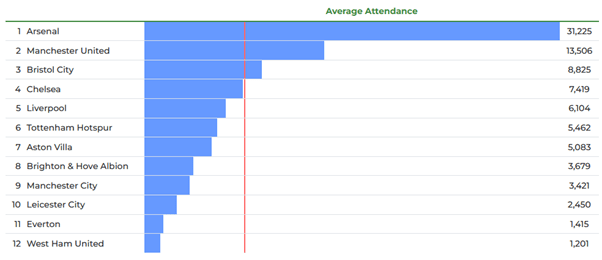 In the first half of 2023 (Jan-May 2023; end of the 22/23 season) Spurs Women’s average home attendance was 5,907. This has dropped marginally to 5,462 in the 2023/24 season so far. These numbers are not terrible, but as the chart above shows, are massively boosted by occasional games in the main stadium. The averages would also be lower if all of the missing attendance data (largely from games at Brisbane Road) were included.