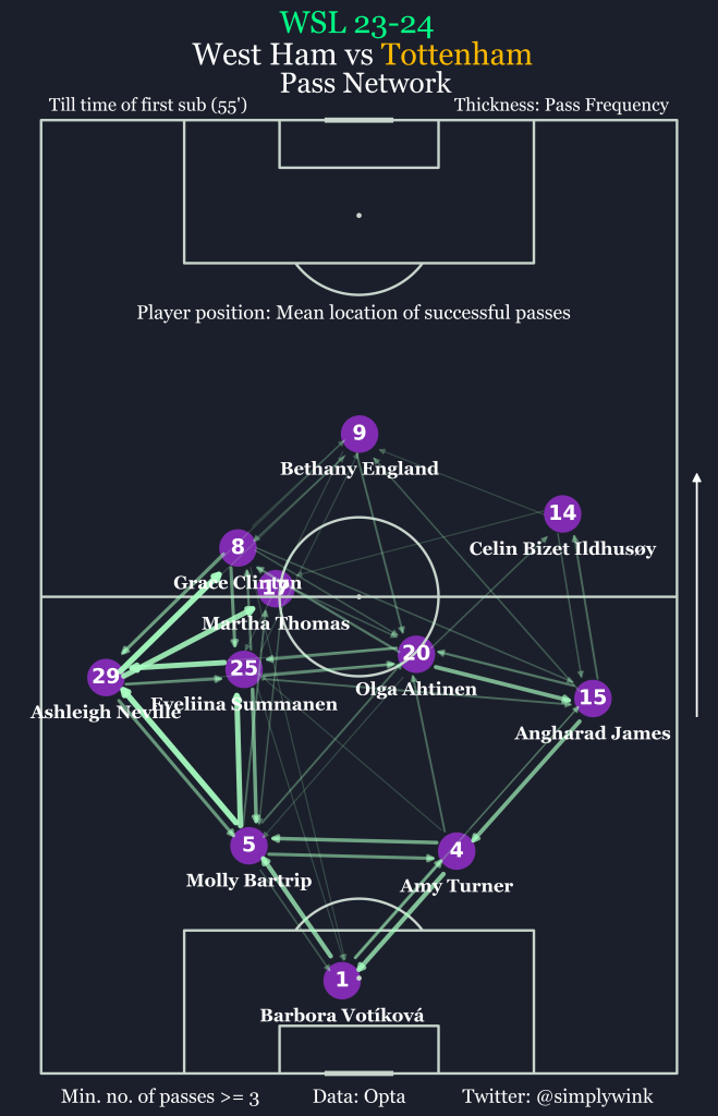 Robert Vilahamn has conceded that playing Summanen in this position was perhaps a mistake. But with centre back numbers in short supply, if this is something that is potentially going to be tried again, I would hope that Spurs’ team analysts are keeping note of the number of line breaking passes our opposition make, with versus without Summanen in the midfield (I would have liked to be able to explore this, but there are not available open data). What is visible in the pass data, above, is how central Summanen was to Spurs’ passing networks prior to her 56th minute move back.