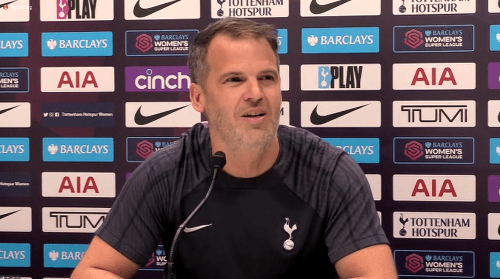 In the run up to their WSL game against Leicester City Spurs’ manager revealed that Daniel Levy had texted to congratulate him after the FA Cup quarter-final win over Manchester City. He also said that he’d like to play the semi-final in the main stadium, confirmed that the club plan to retain Amanda Nildén at the end of the season, described player-coach relationships as unacceptable, talked about healthy competition for places, the squad’s growing fitness and praised Amy James-Turner, Ashleigh Neville and his three keepers, among others.