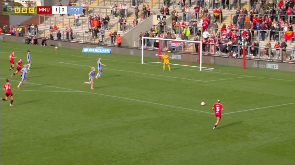 In terms of picking up players in the box, for the first goal Terland positioned herself with Bartrip goalside but was able to extend her raised leg around Bartrip to meet the ball. For the second Terland who headed the ball, was the goalside of Ashleigh Neville with Galton behind Neville. Meanwhile Bartrip moved forward, to double-team Clinton with Hunt, thereby allowing space in front of Terland. One of the issues for both goals was that United had a lot of goal-threats in the box and in both cases Terland deserves credit for perfectly hit shots, but the concern for Spurs is that she was not adequately picked up either time.